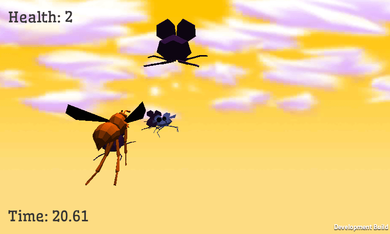 Things were finally coming together. I replaced the placeholder wasp with a wasp that I modeled and animated. I even added health (a limit of three hits) and a score, which I ultimately found redundant compared to just time. I realized that it was difficult to survive much longer than two minutes, and I thought that was a reasonable scope for a small android game.